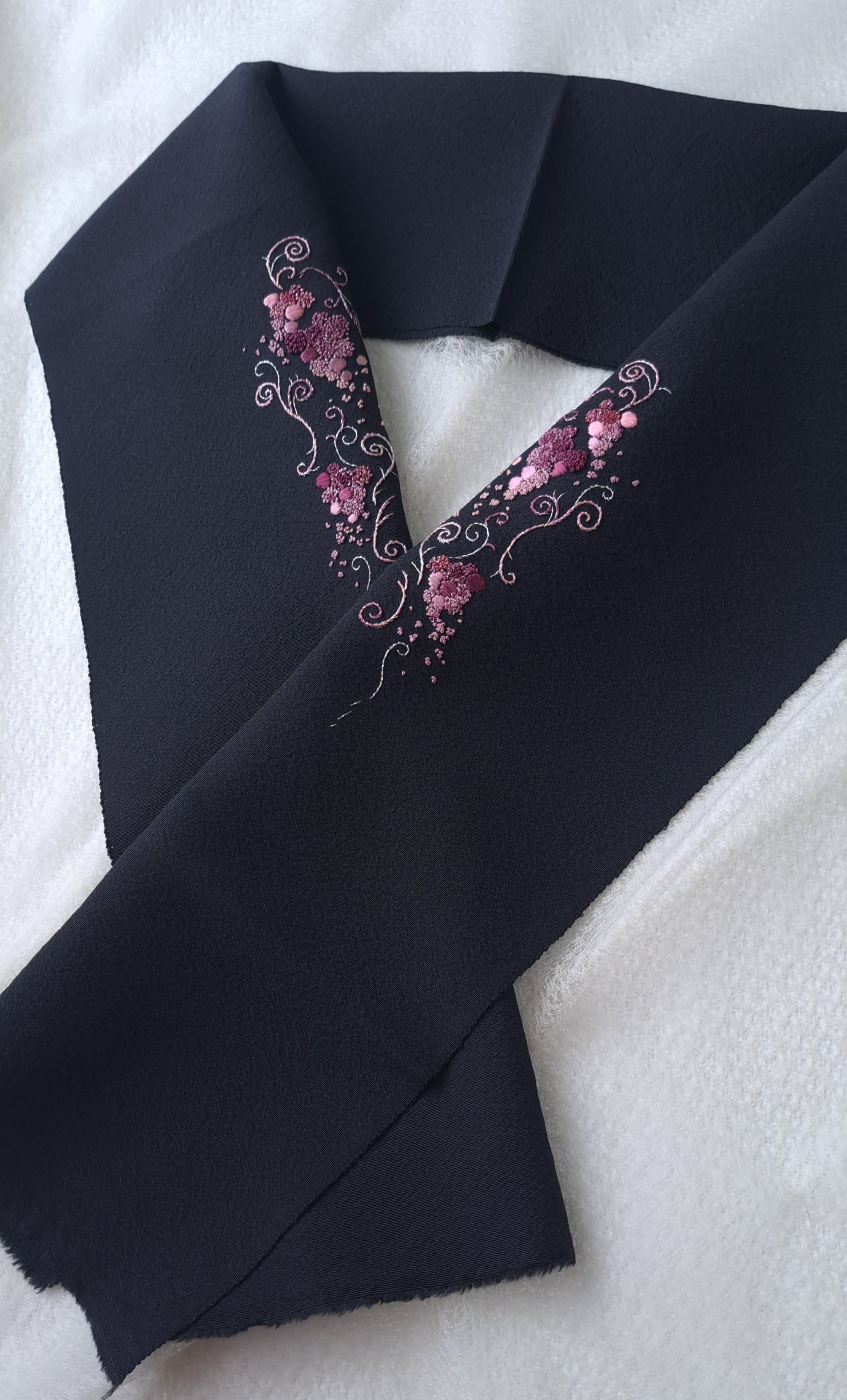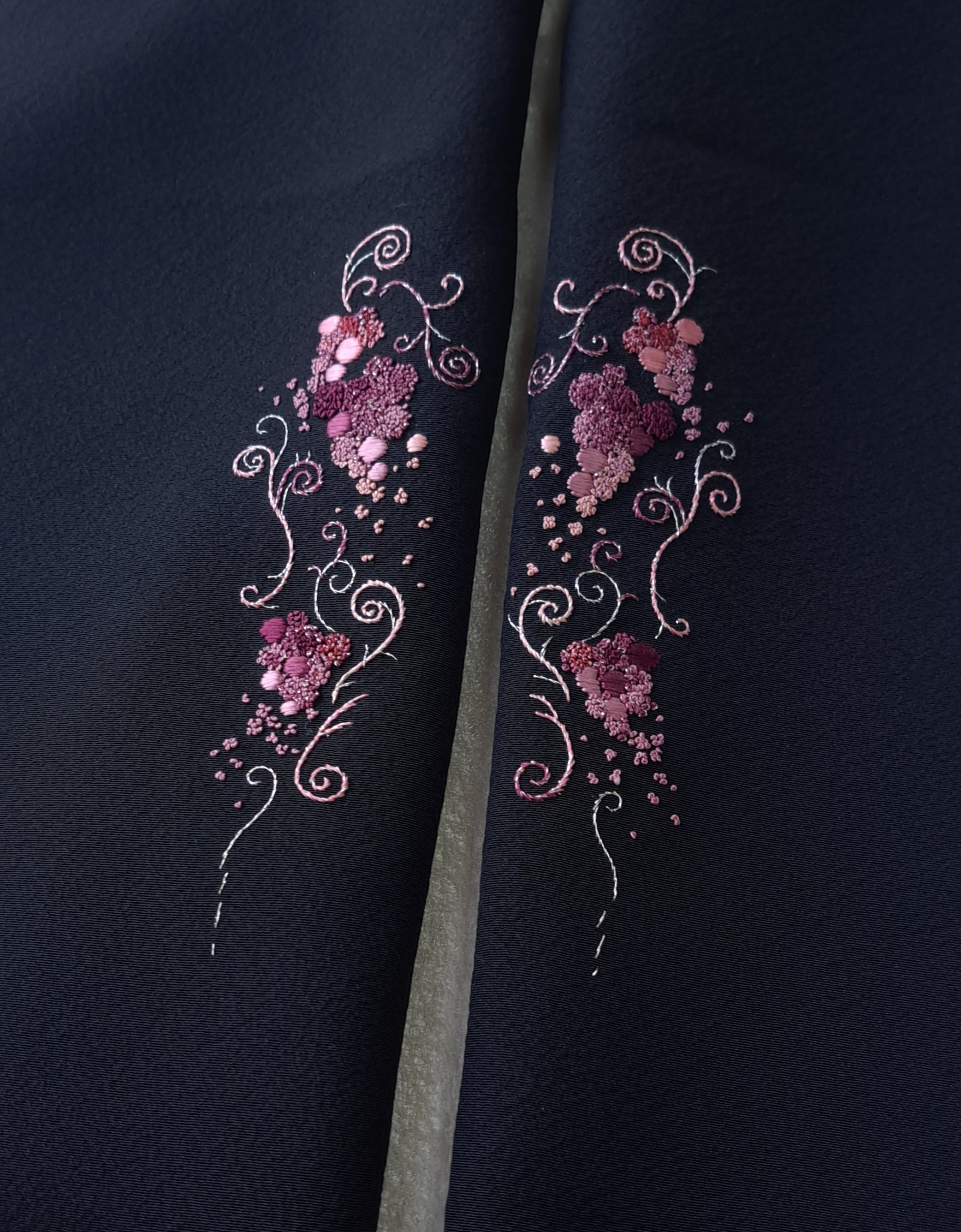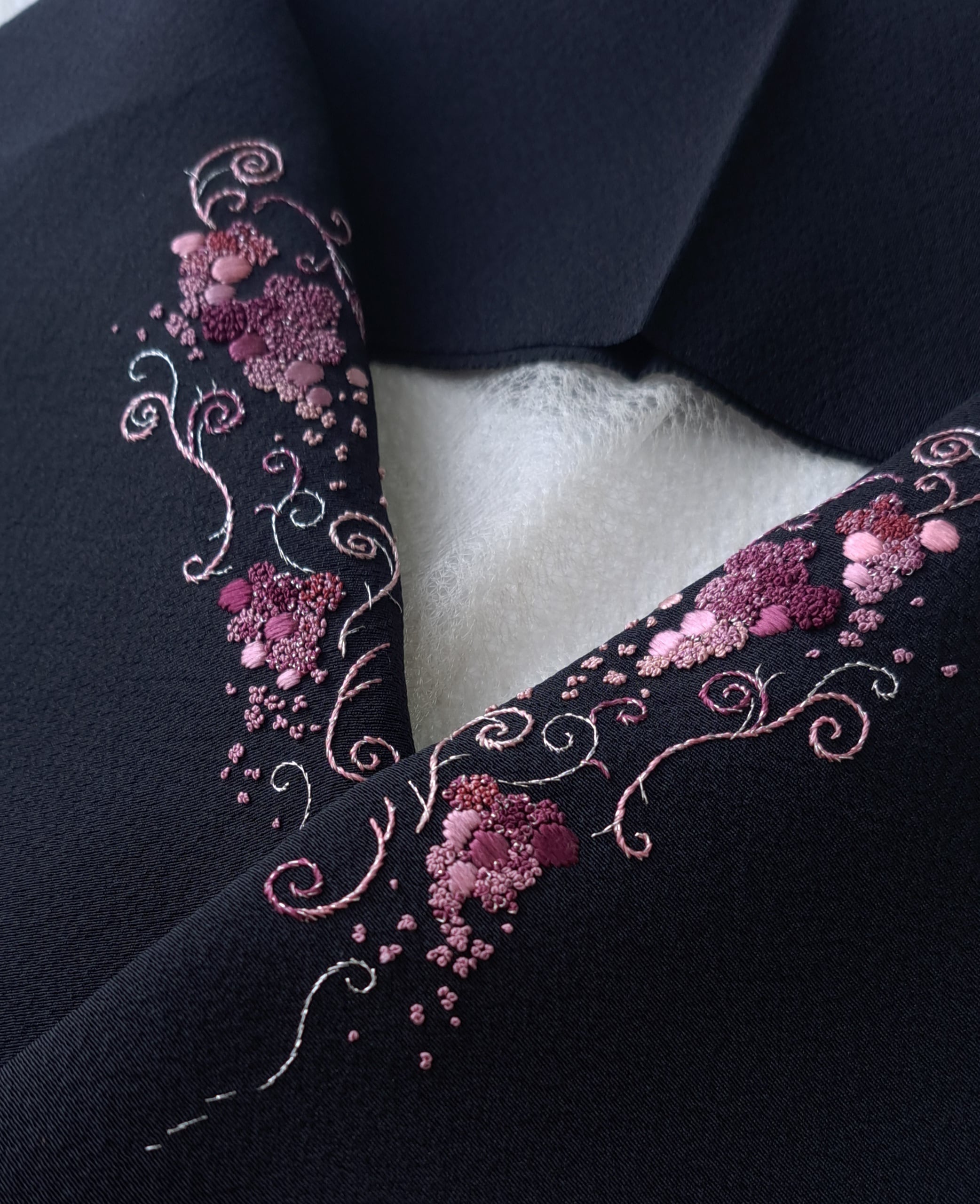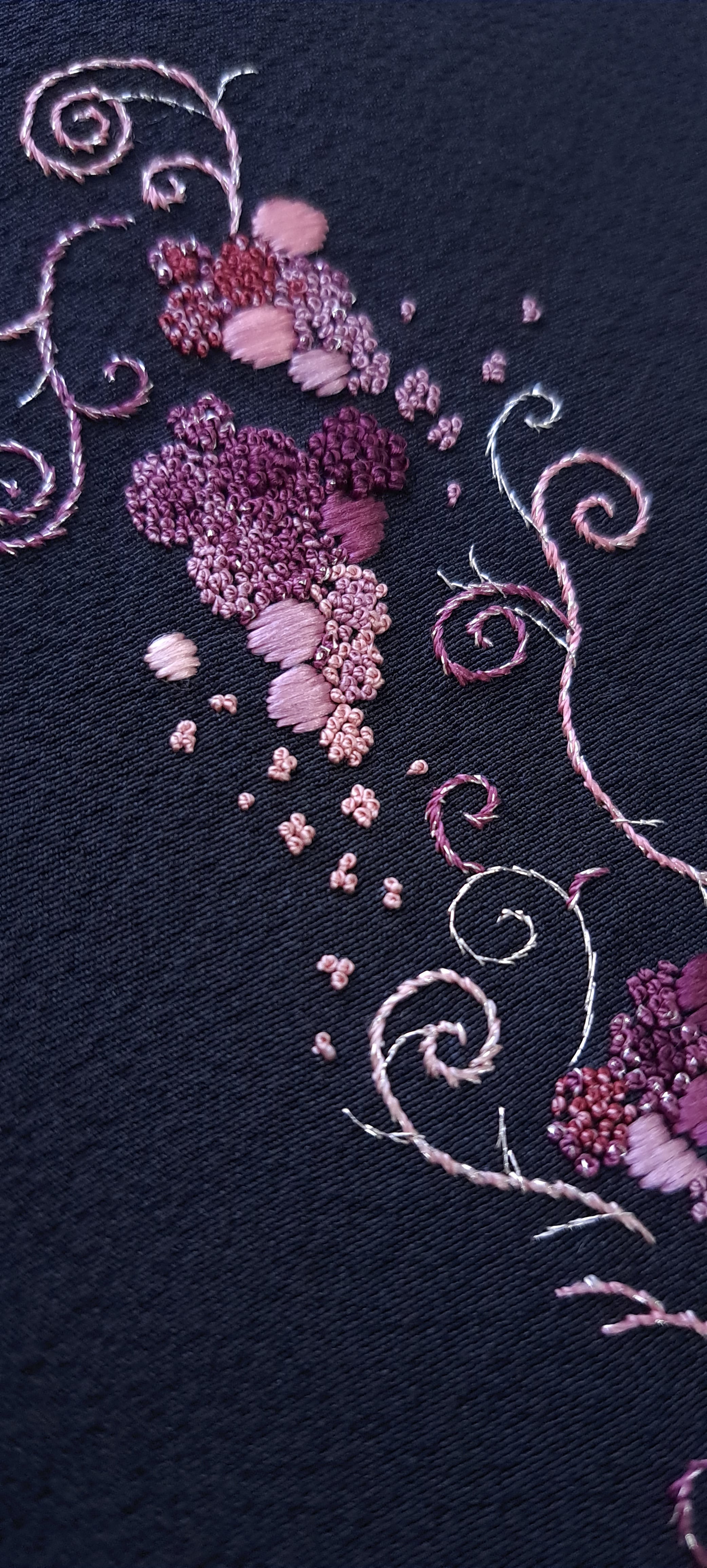 黒縮緬を重たく感じさせないように、華やかに銀糸を使いお作りしました。