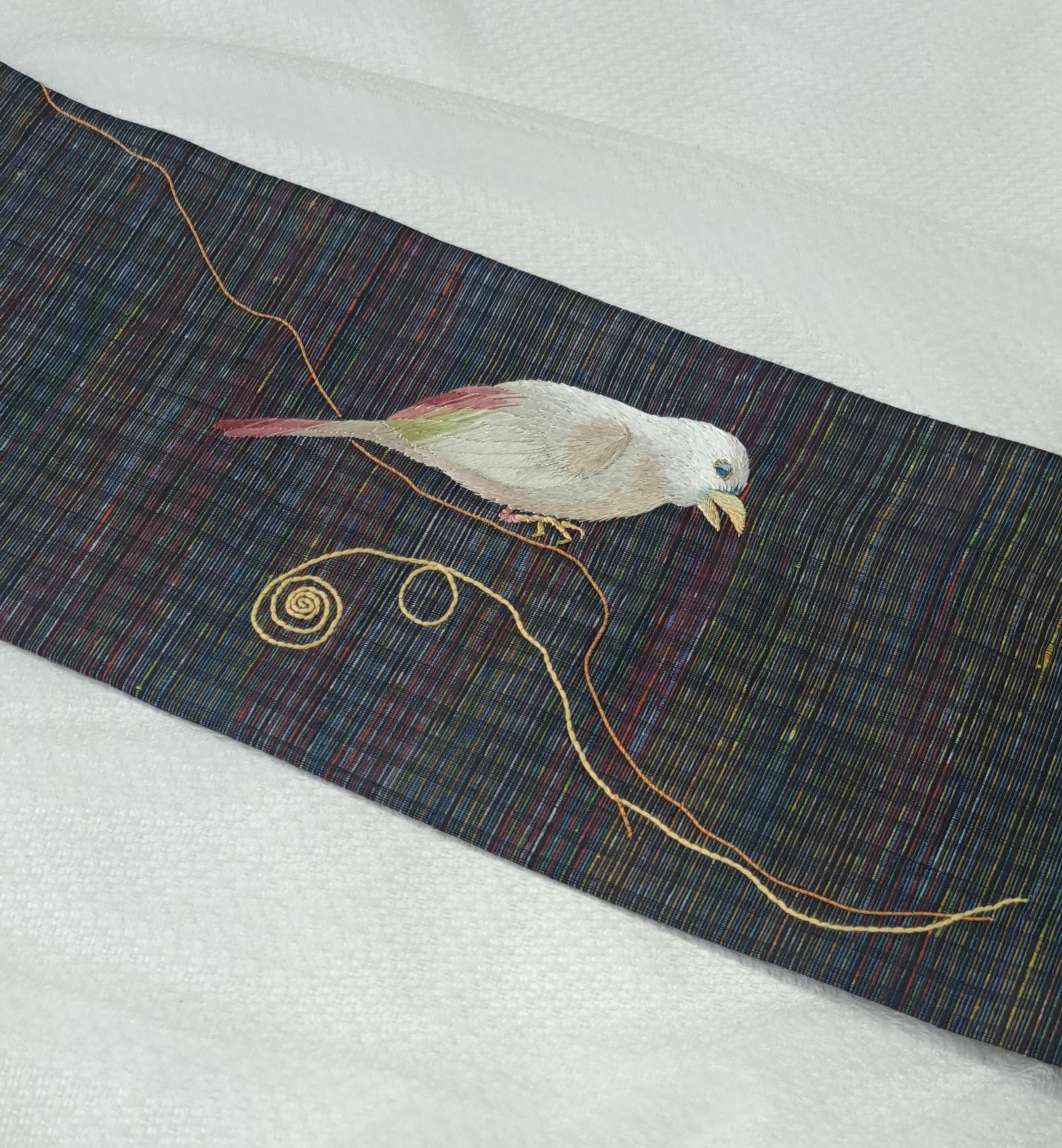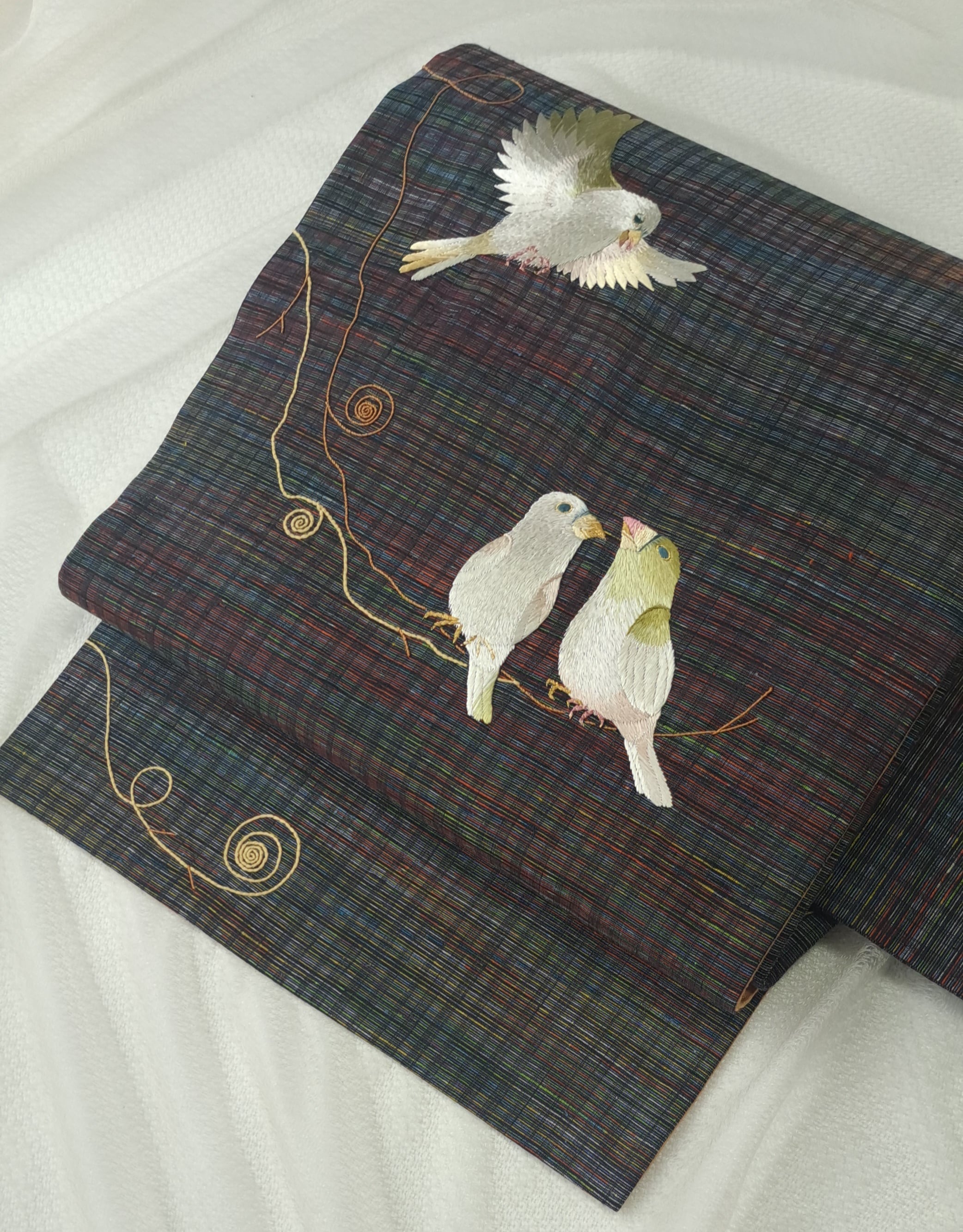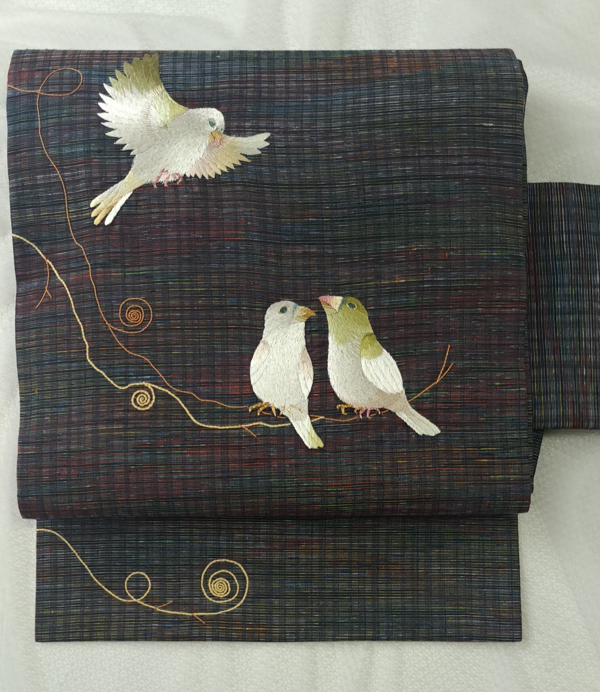 帯地の色味を鳥や枝に配色して